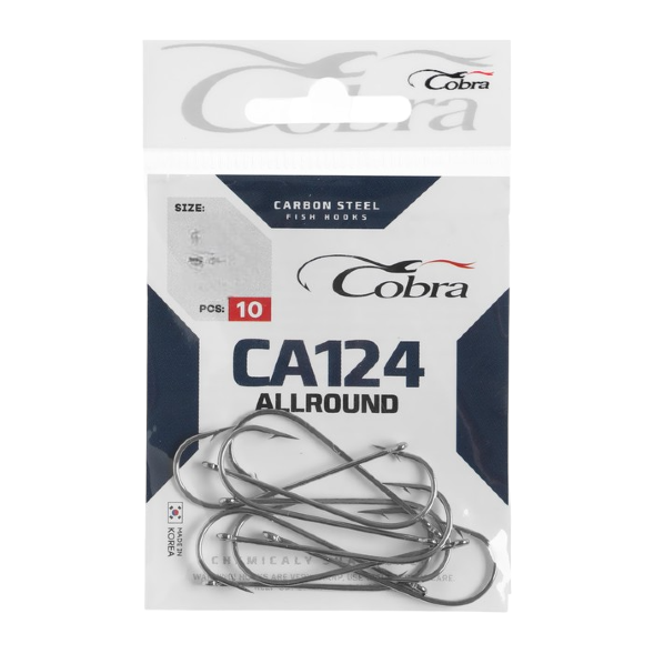 Cobra CA124 Allround - серия крючков, которая имеет идеальную форму округлого затылка, прямого лба, среднего по размеру цевья и удлиненного жала с бородкой. Эти детали формы делают эти крючки универсальными в использовании. Особо актуально их использование при подборе крючка для ловли на незнакомом водоеме. Ими можно ловить практически на всех водоемах, со всеми типами насадок и по всем видам рыб. Главное правильно подобрать размер крючка под условия ловли и ожидаемую рыбу. Представленный в серии широкий размерный ряд позволит осуществить этот процесс без проблем. Cильно вытянутое и прямое цевье и параллельно направленное ему короткое жало – особенности одинарников Cobra CA124 Allround. Изготовлены данные крючки из высокоуглеродистой проволоки, которая выдержит вываживание норовистой добычи. Имеют химическую заточку для высокой проникающей способности и бородку для лучшего удержания добычи. Продуманная конструкция одинарников Cobra CA124 рассчитана на применение крупных насадок и для охоты на больших размеров добычу. Удлиненное цевье, в частности, снижает риск перекусывания оснастки. Для крепления создатели предусмотрели аккуратное ушко, которое позволяет использовать модели с монофильной или плетеной леской.